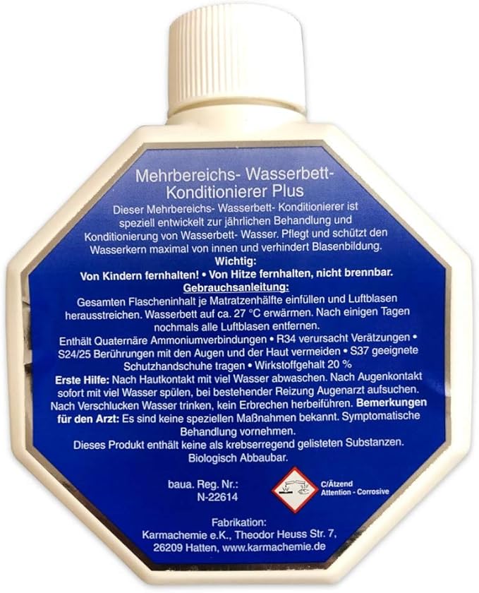 Dieser Mehrbereichs-Wasserbett-Konditionierer Plus ist speziell entwickelt zur Behandlung und Konditionierung von Wasserbett-Wasser. Pflegt und schützt den Wasserkern maximal von innen und verhindert Blasenbildung.